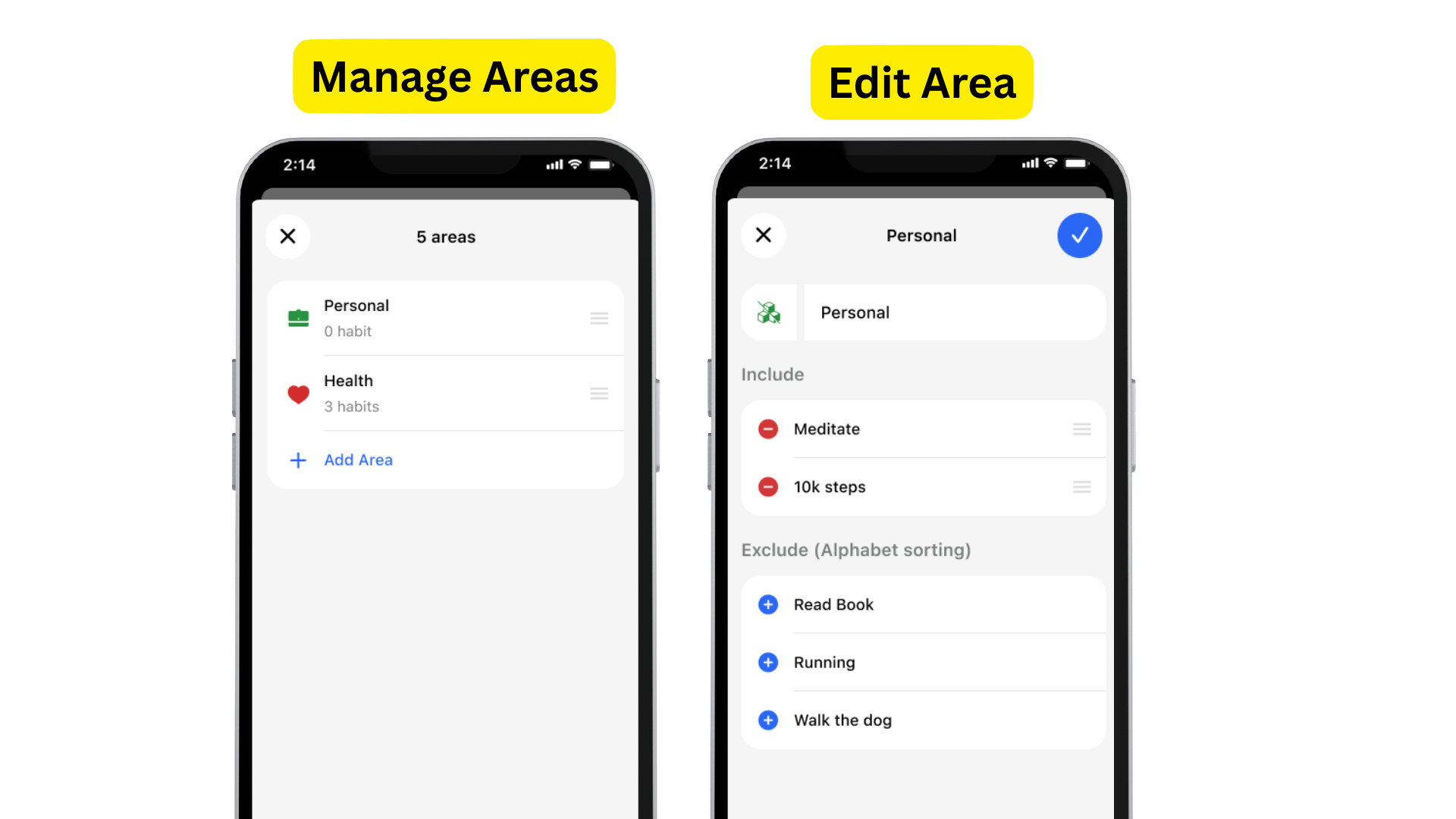 Deep Editing: You can now tap directly on any Area to open a detail view. From there, you can edit the Area's info and—most importantly—manage exactly which habits are included or excluded in one simple list.