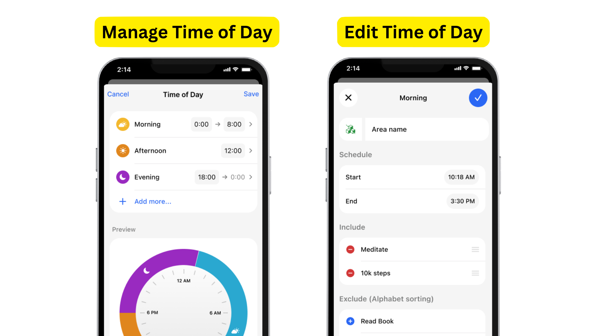 Easy Toggles: Simply tap on a Time of Day to see everything scheduled for that period. You can add or remove habits from that specific time block instantly, without having to navigate back to individual habit settings.