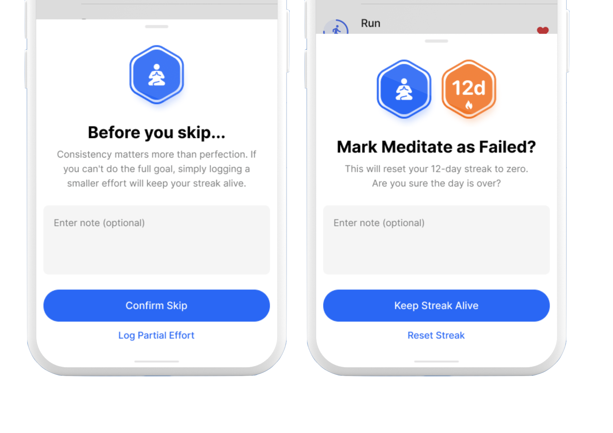 Add Notes: For both actions, you can now add a quick Note right in the popup. Whether you were sick or traveling, recording the why helps you understand your patterns later.