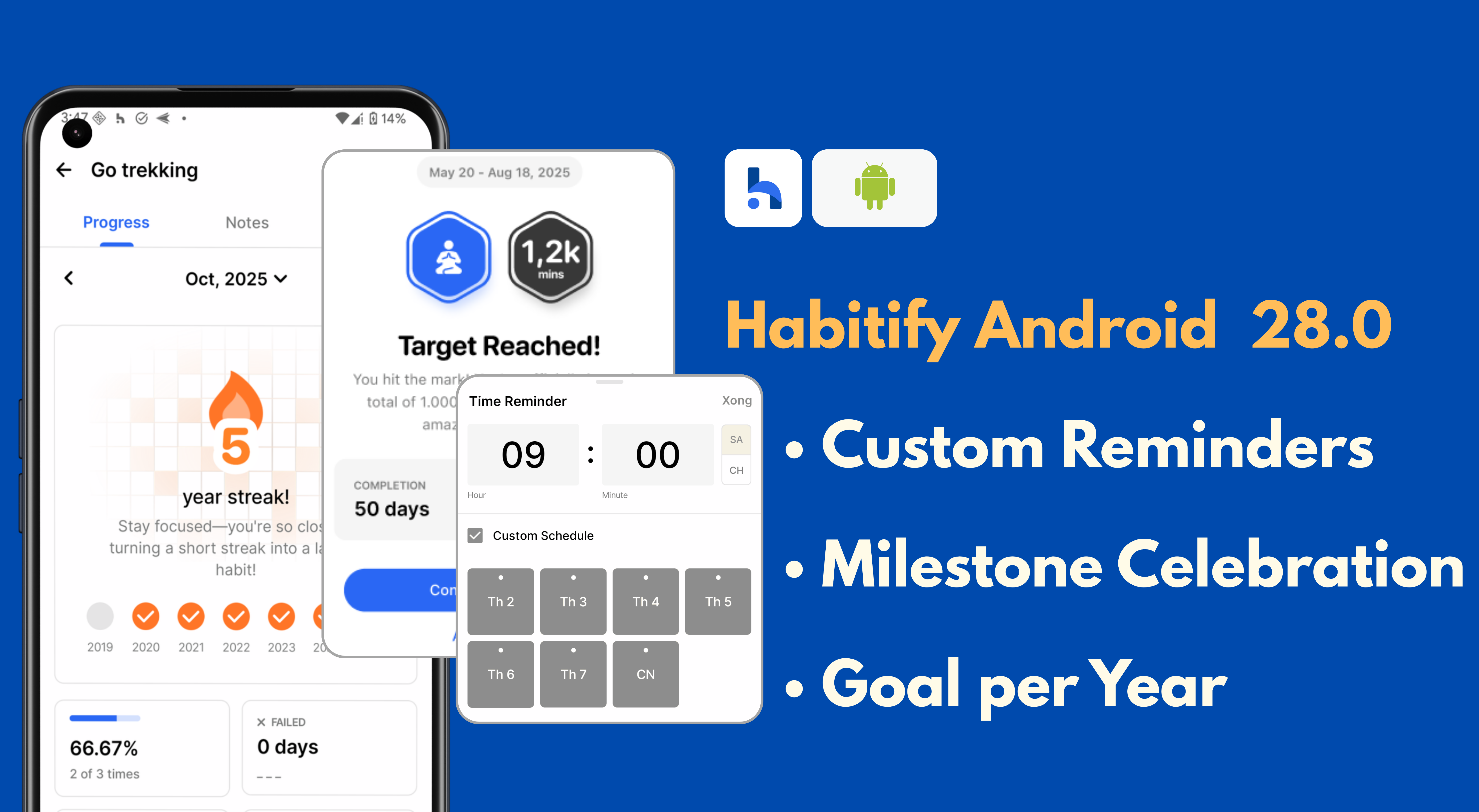 Habitify Android 28.0: Reminders for Different Days, Milestone Celebrations, and Goal per Year.