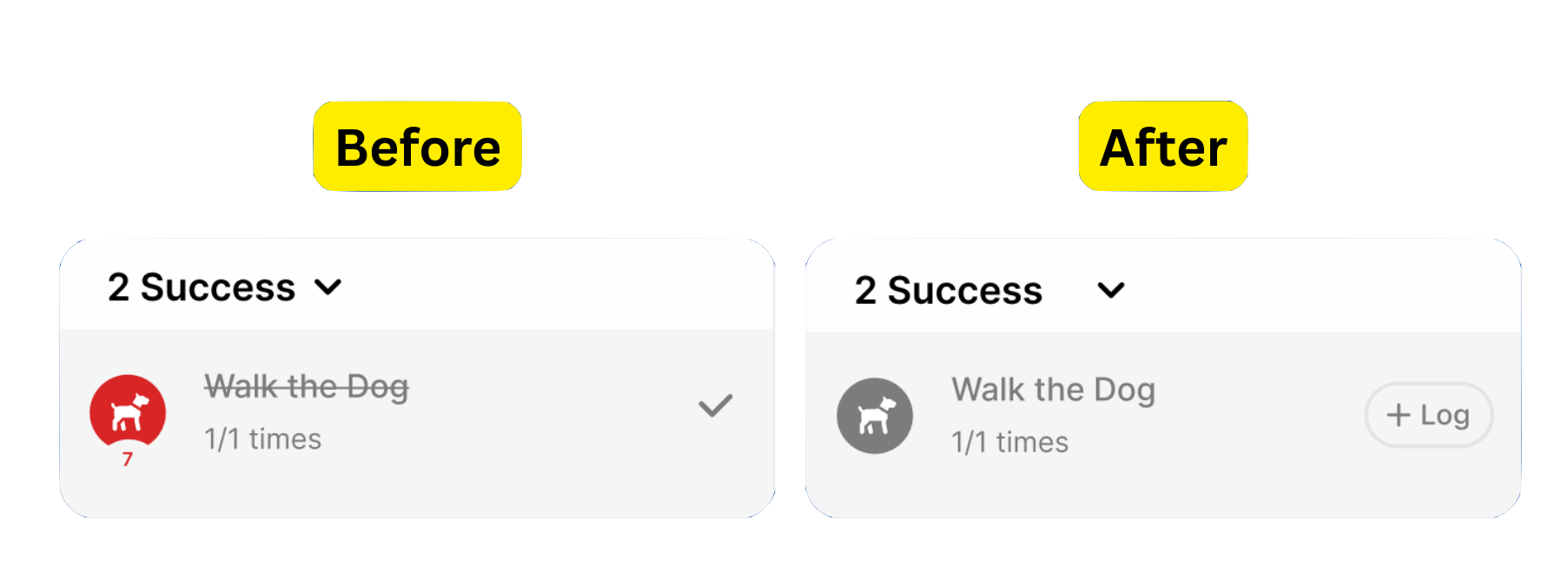 The New "Log" Button: Now, even after a habit is marked complete, a "Log" Smart Button remains available.