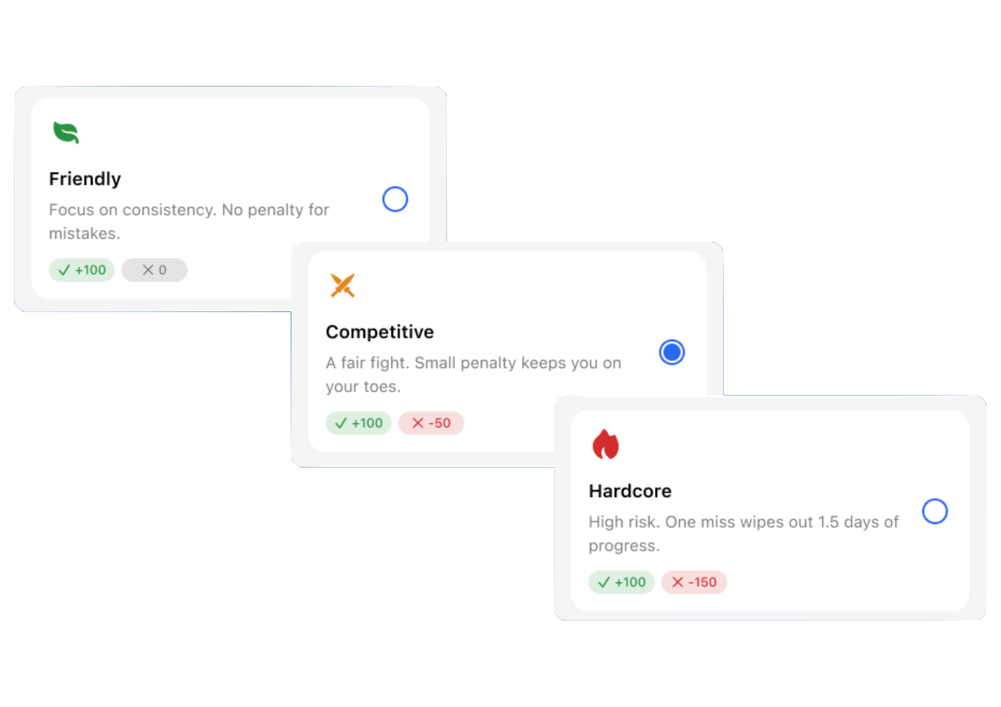 ⚔️ Competitive: A fair fight for those who want a nudge. A small penalty (-50 points) keeps you on your toes if you miss a day.