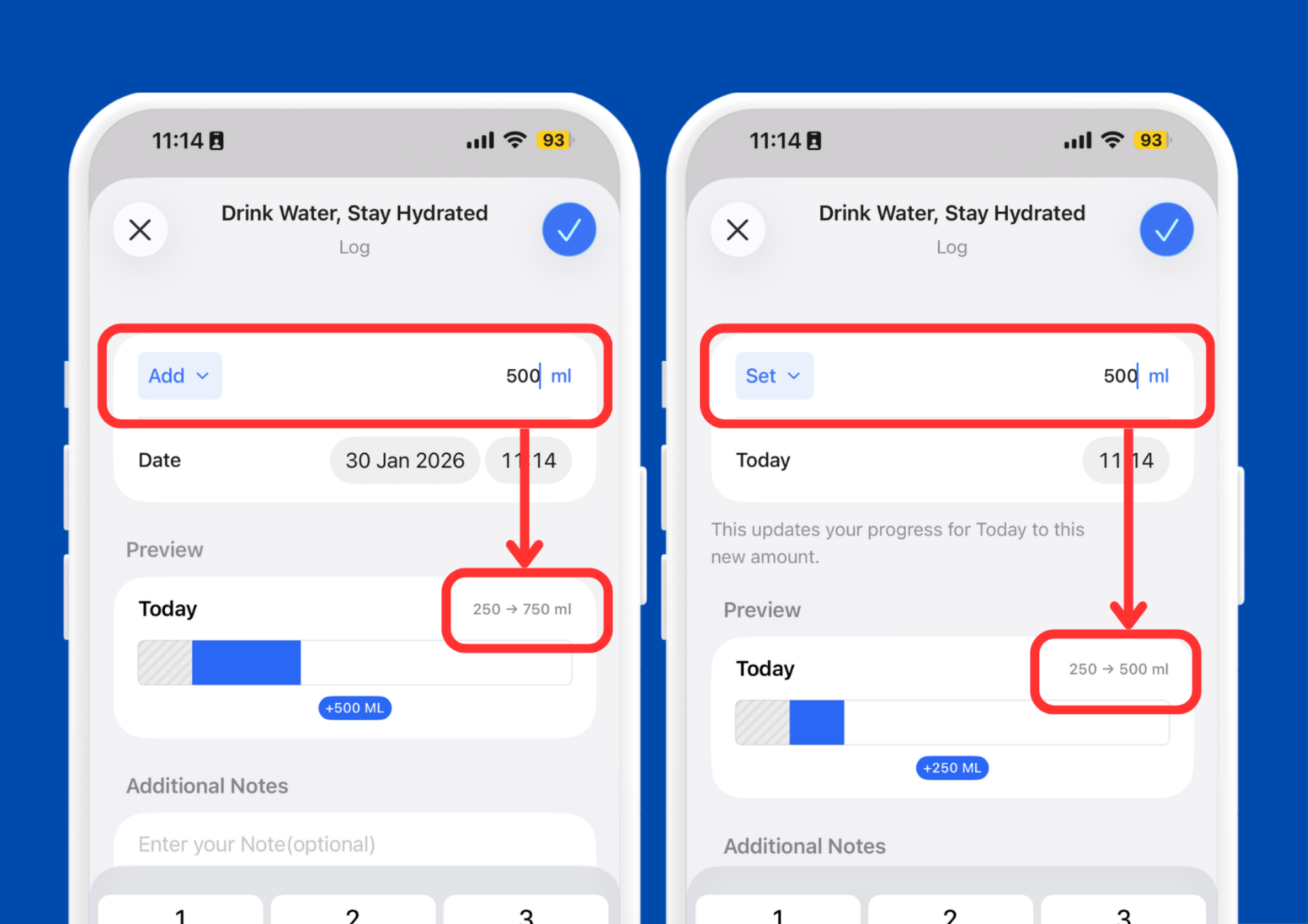 We’ve revamped the Log Progress screen to save you the mental math. Previously, you could only add to your current total. Now, you have two distinct modes to track your way: