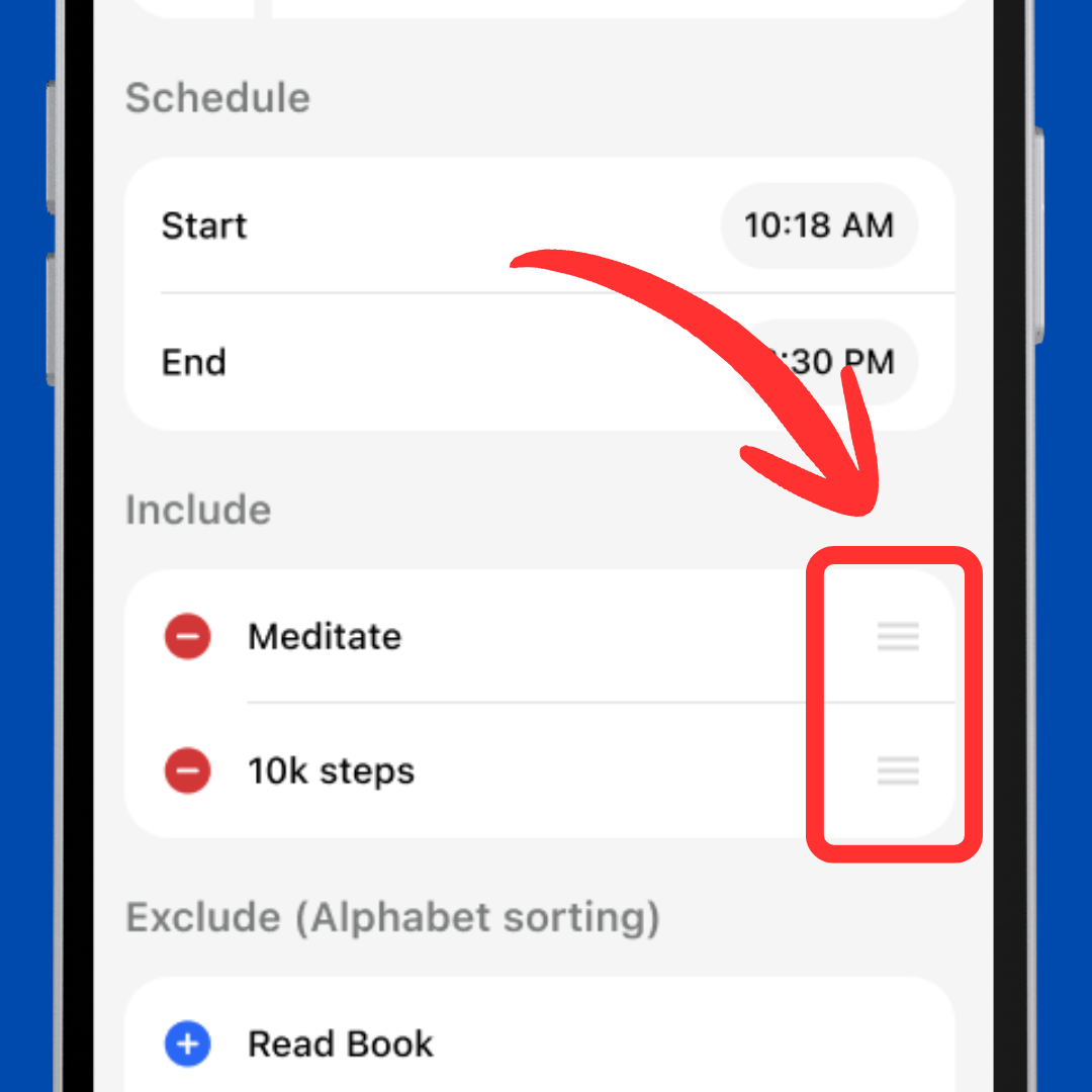 In the settings of each time of day, simply drag and drop the included habits to arrange them exactly how you plan to tackle them.