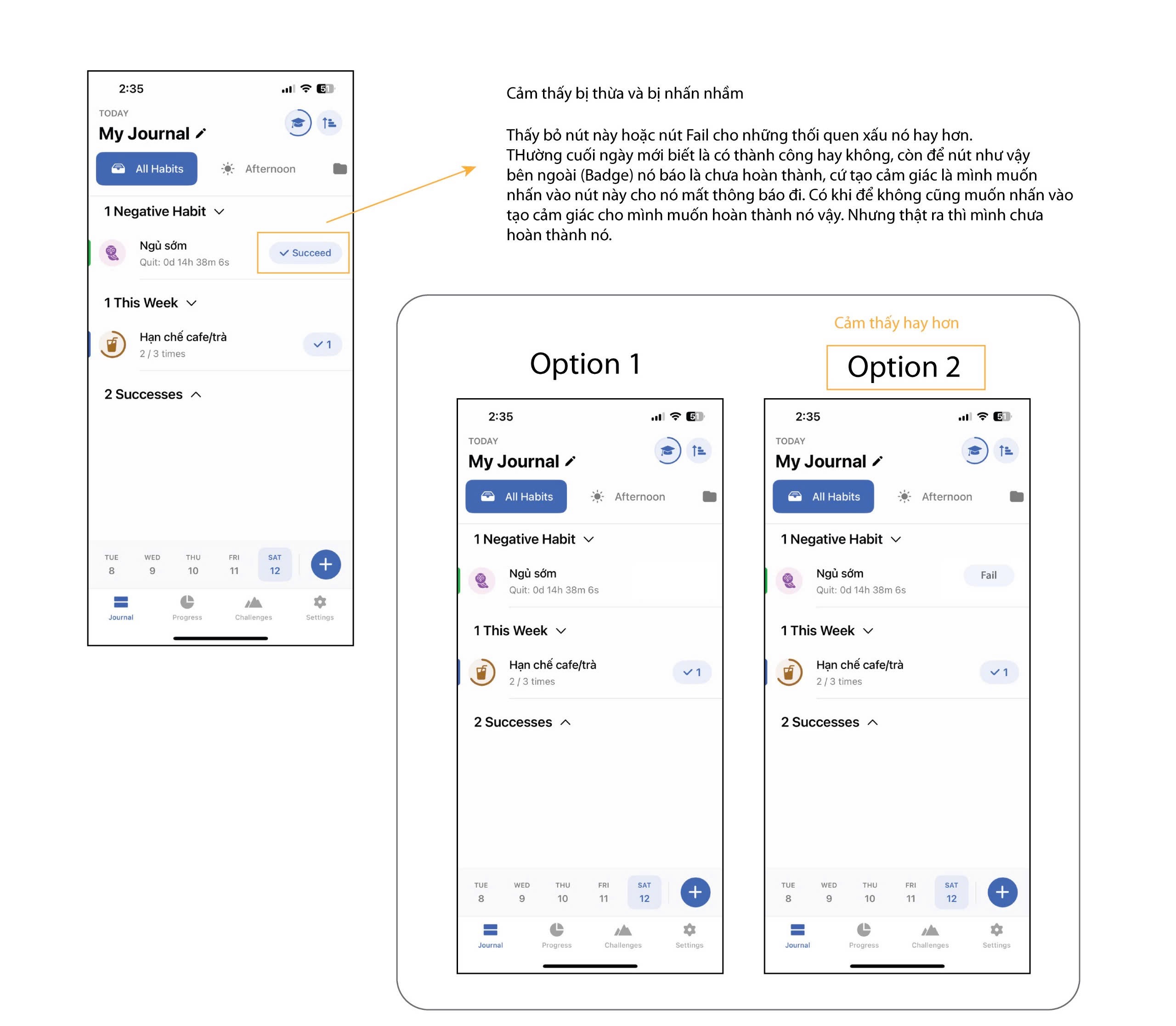 It's better to remove the button or replace it with the “Fail” button. It's better to remove the button or replace it with a "Fail" button. We can't know if we've succeeded in getting rid of the bad habit until the end of the day. However, the button always encourages us to press it and mark the bad habit as successful for the day, even though we haven't actually succeeded yet.