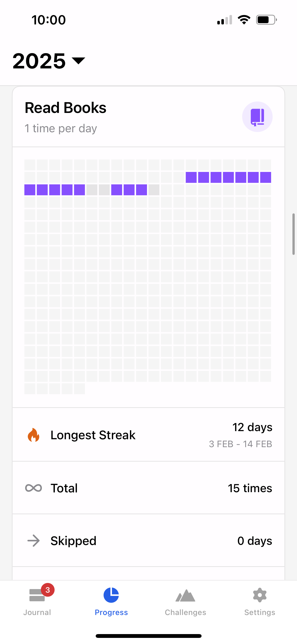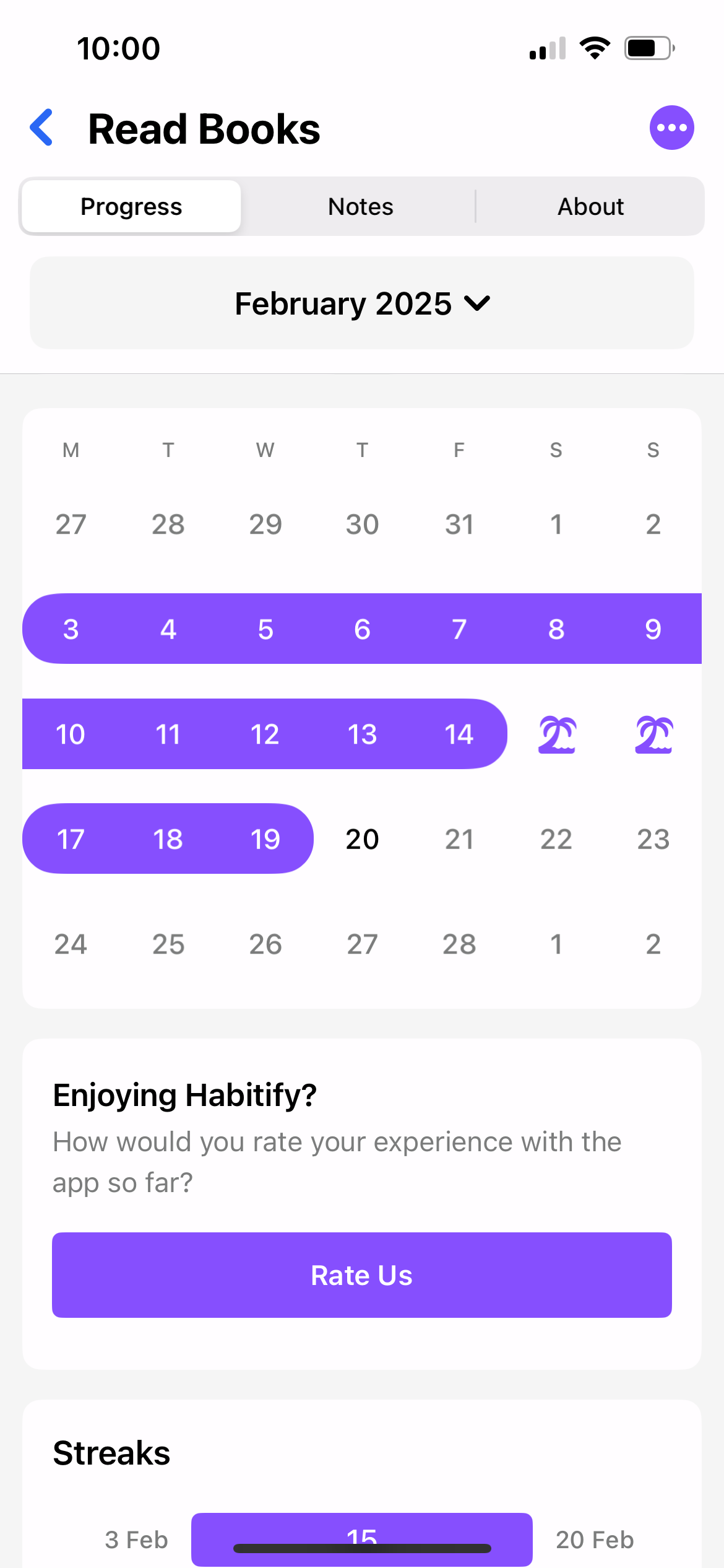 When I click in to each habit, it shows the holiday icons with my current streak undisturbed by the holiday. However, on the Progress tab it doesn’t (it appears my streak has ended).