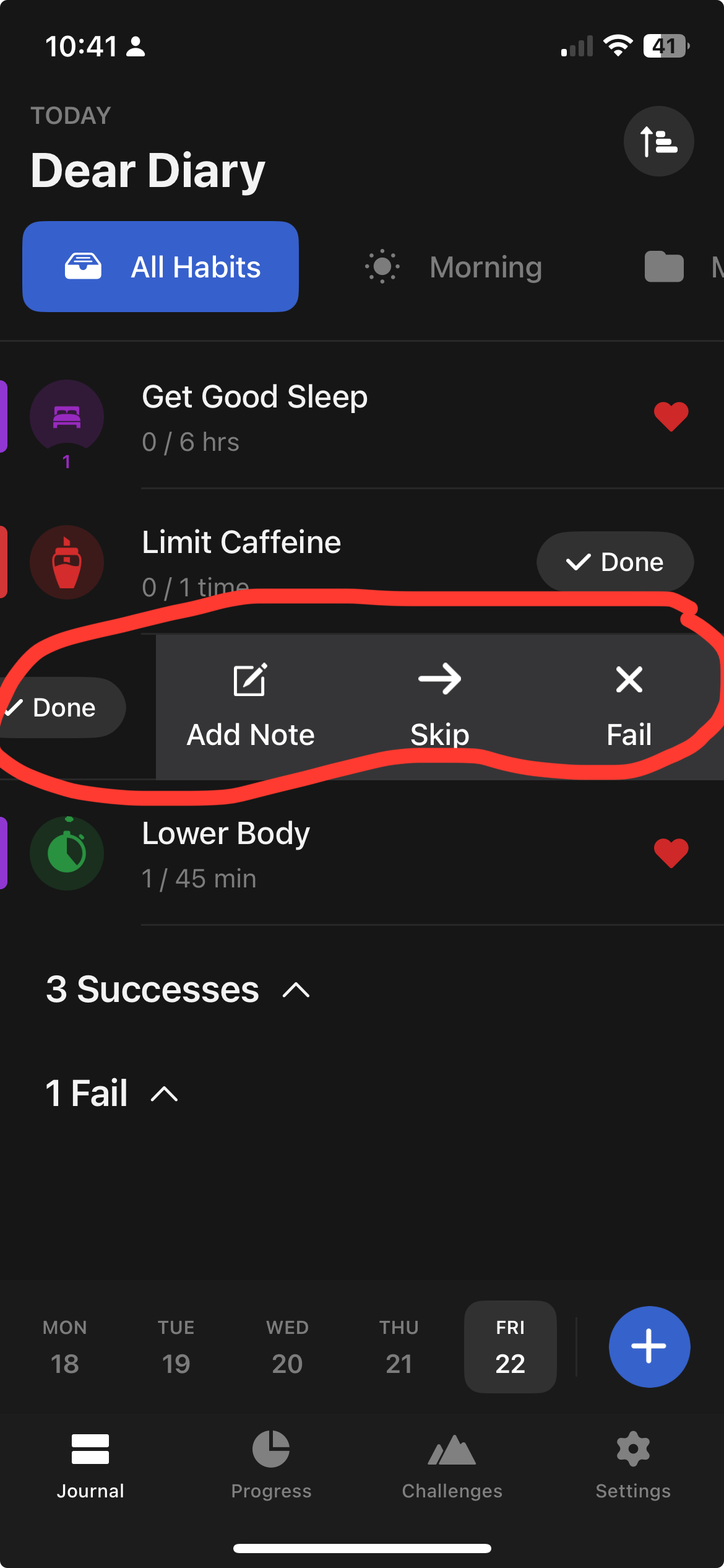 I have a bunch of habits that repeat on a particular days every week. Sometimes I don’t get time to finish them a particular day and wish I could reschedule it to another day within the same week rather than skipping or marking them as Fail. In the action slider for each habit please add a Reschedule/Snooze button.