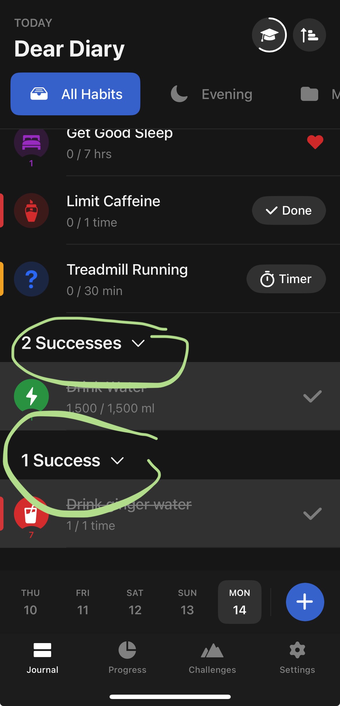 As soon as I completed the second habit for the day I started seeing two separate collapsible headers. Both habits should just have been under “2 successes”. Clicking on either heading so collapsing/expanding both.